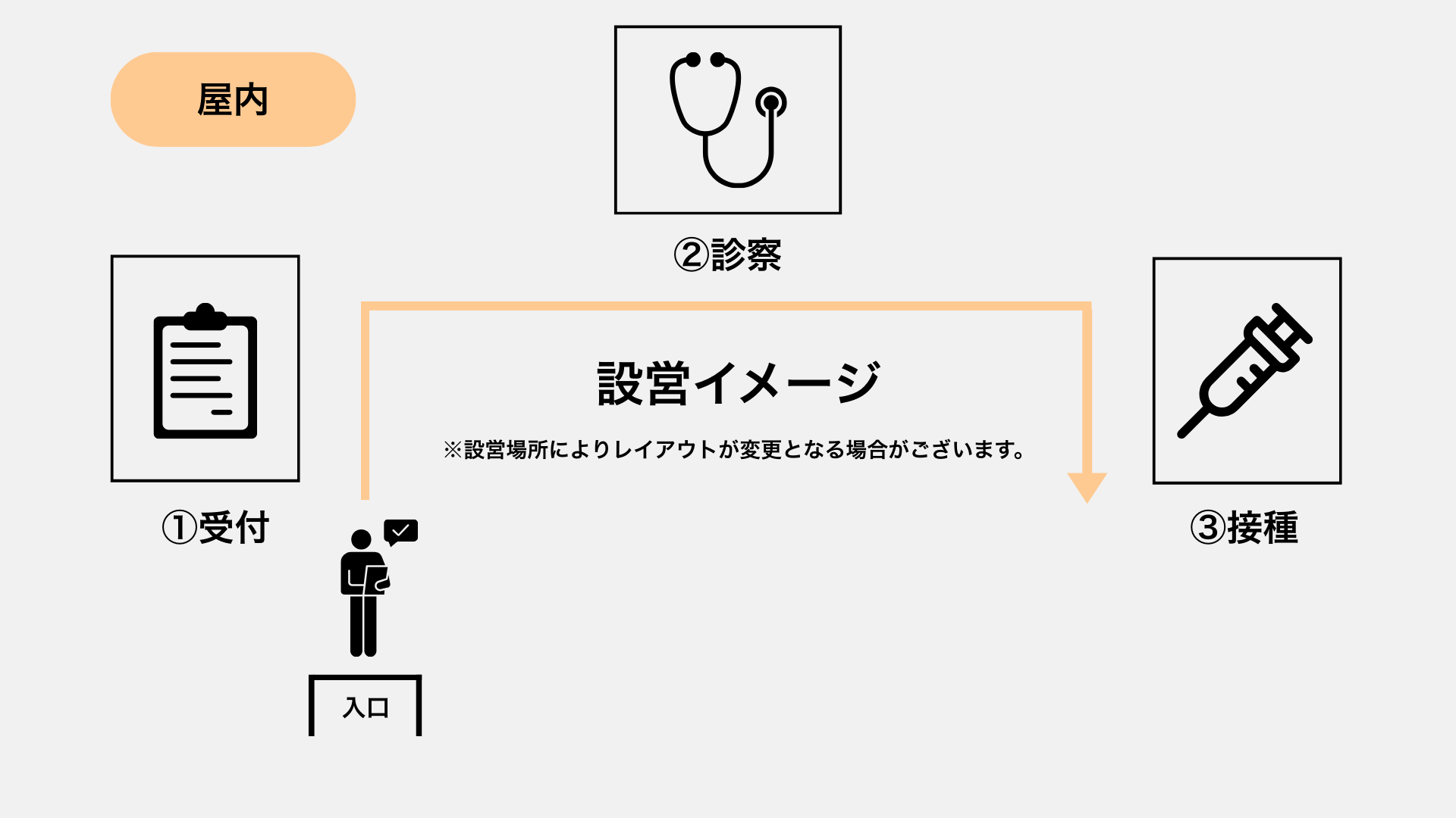 企業様または指定された場所に赴いて、設営・準備など一切を行います。接種会場での案内は、経験豊富なスタッフが迅速かつ丁寧に対応しますので、受診者様は事前にお渡しする予診表を持参いただくだけで問題ありません。これにより、就業時間や待機時間を最小限に抑え、交通費などの経費も削減でき、非常に効率的に予防接種を実施できます。