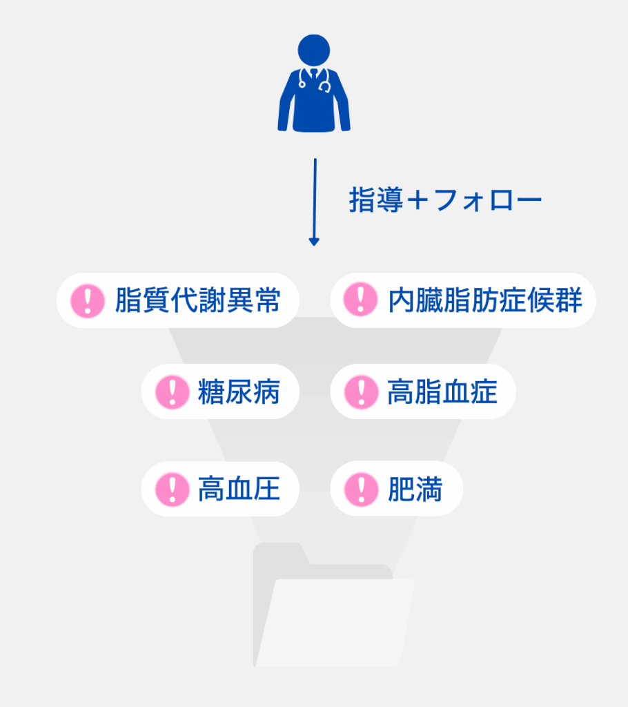 短期間で受けられる巡回健診では、従業員全体の健診データが早期に収集されるメリットもあります。健診後、生活習慣病のリスクが高いとされる従業員には、特定保健指導サービスを提供しています。単に健診を実施するだけでなく、従業員の今後の生活習慣にも配慮したサポートが可能です。