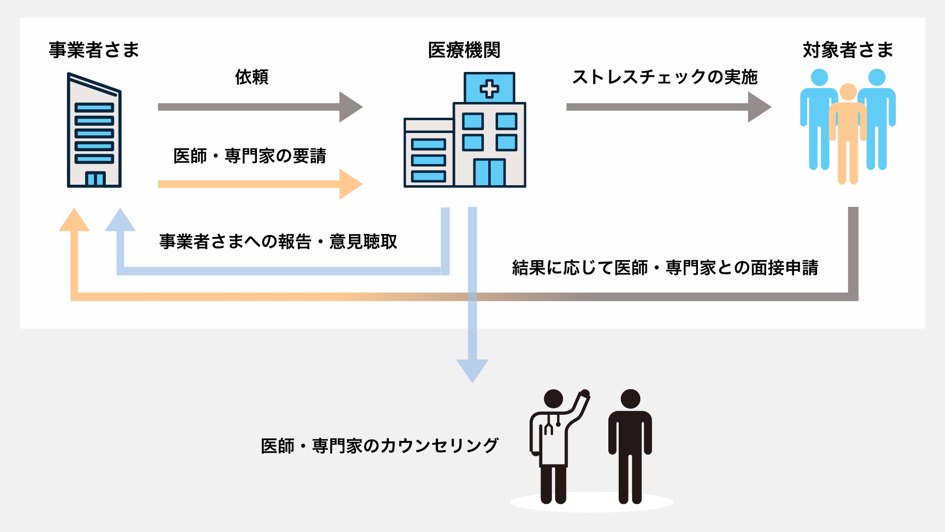 医師や専門家との面談では、現状のヒアリングや今後の対応に関するアドバイスを実施。必要に応じて、事業者様への意見聴取も行い、職場改善に向けた一歩をご提案します。
